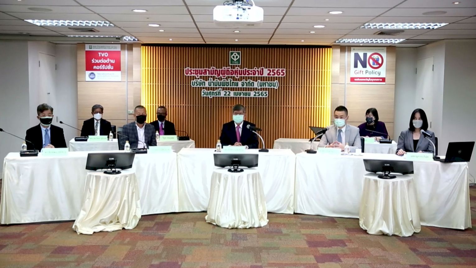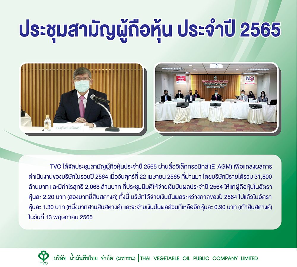 25 August 2022Thai Vegetable Oil Public Company Limited (TVO) held the Annual General Meeting of Shareholders via electronic media (E-AGM) to announce the Company's performance for the year 2021 on Friday, April 22, 2022, with total revenue of 31,800 million baht and net profit of 2,068 million baht, the meeting resolved to pay dividends for the year 2021 to shareholders at the rate of 2.22 baht per