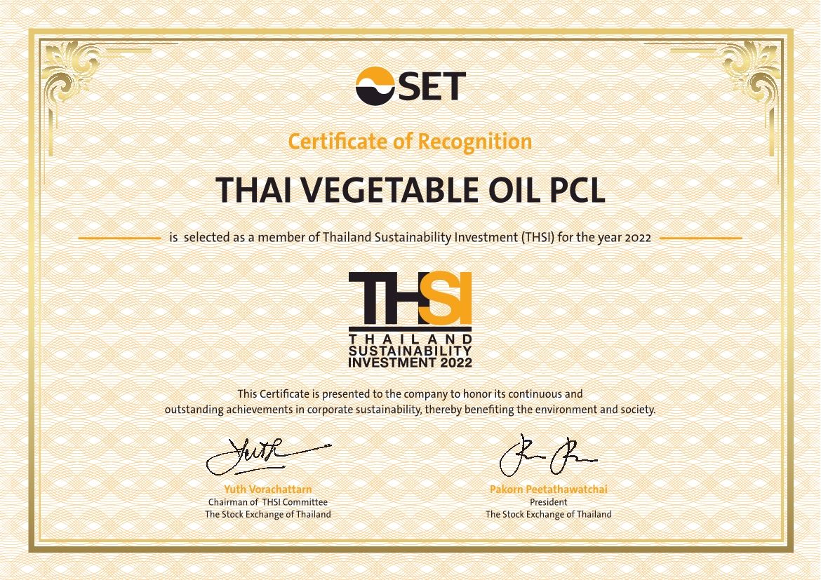 19 October 2022Thai Vegetable Oil Public Company Limited or TVO was ranked as 1 of 170 listed companies of the Thailand Sustainability Investment (THSI) 2022 in Agro & Food Industry categories from SET for 6th year. It reflects the importance of operating a business that takes into account responsibility for all stakeholders along with driving policy and operational goals for Environmental, Social and Governance (ESG) to develop the organization to grow sustainability and generate consistent returns for shareholders.