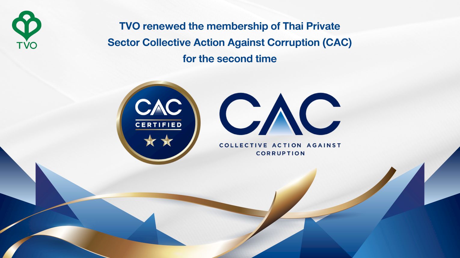 Thai Vegetable Oil Public Company Limited (TVO) has been certified as a member of Thai Private Sector Collective Action Against Corruption (CAC) for the second time. This certification, granted by CAC, is valid for a period of 3 years (2025–2028). It reflects the Company’s comprehensive policies, practices, and governance measures to prevent corruption in accordance with the criteria set by CAC.