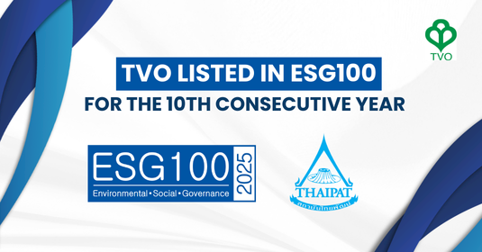 Thai Vegetable Oil Public Company Limited (TVO) has been included in the ESG100 list by the Thaipat Institute for the 10th consecutive year (2016–2025). The recognition reflects the company’s strong performance in environmental, social, and governance (ESG) practices. The selection was based on an assessment of 921 listed securities and mutual funds, using publicly available information disclosed on the company’s website. The evaluation covered ESG practices as well as business performance, demonstrating TVO’s alignment with sustainable development principles and its commitment to creating long-term value for stakeholders.